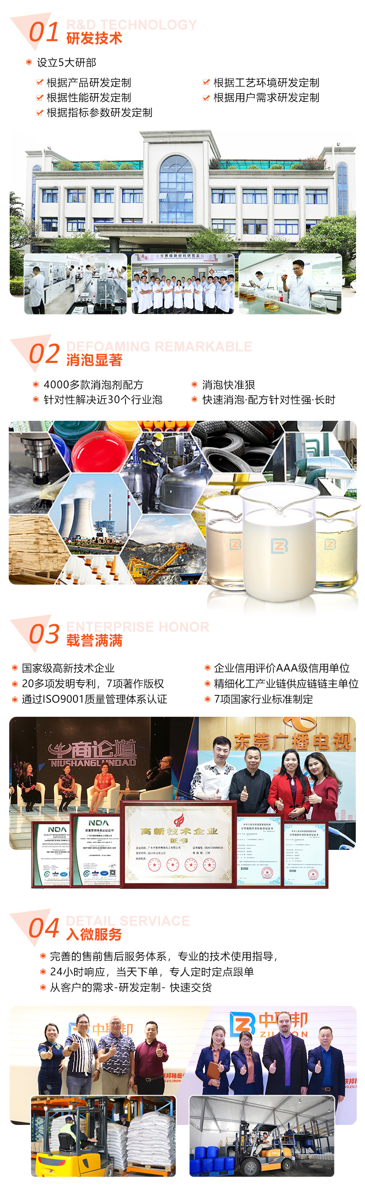 在2017年,曾受CCTV牛商論道專訪企業,同年曾受東莞電臺《歲月留聲》欄目專訪。到目前為止,已研發4000多款消泡劑生產配方,針對性解決了近30個行業的泡沫難題。主要的消泡劑應用行業有:水處理工業、金屬加工液、工業清洗、水性涂料、采礦選礦、造紙工業、水性粘合劑、發酵、油田、電池新能源、紡織印染、萃取工業、建筑材料、油墨油漆、電廠脫硫、泥漿工業、農業等領域。